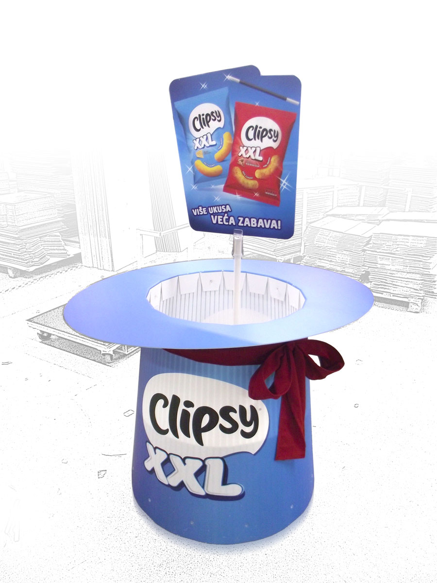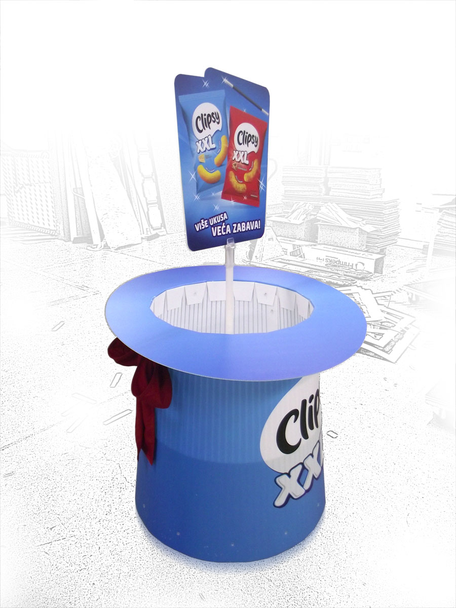 Zahtev klijenta je bio da dno displeja bude na određenoj visini da bi moglo da nosi lagane proizvode i kako bi imalo izgled cilindra u obostranoj štampi i mašnu obmotanu oko šešira.